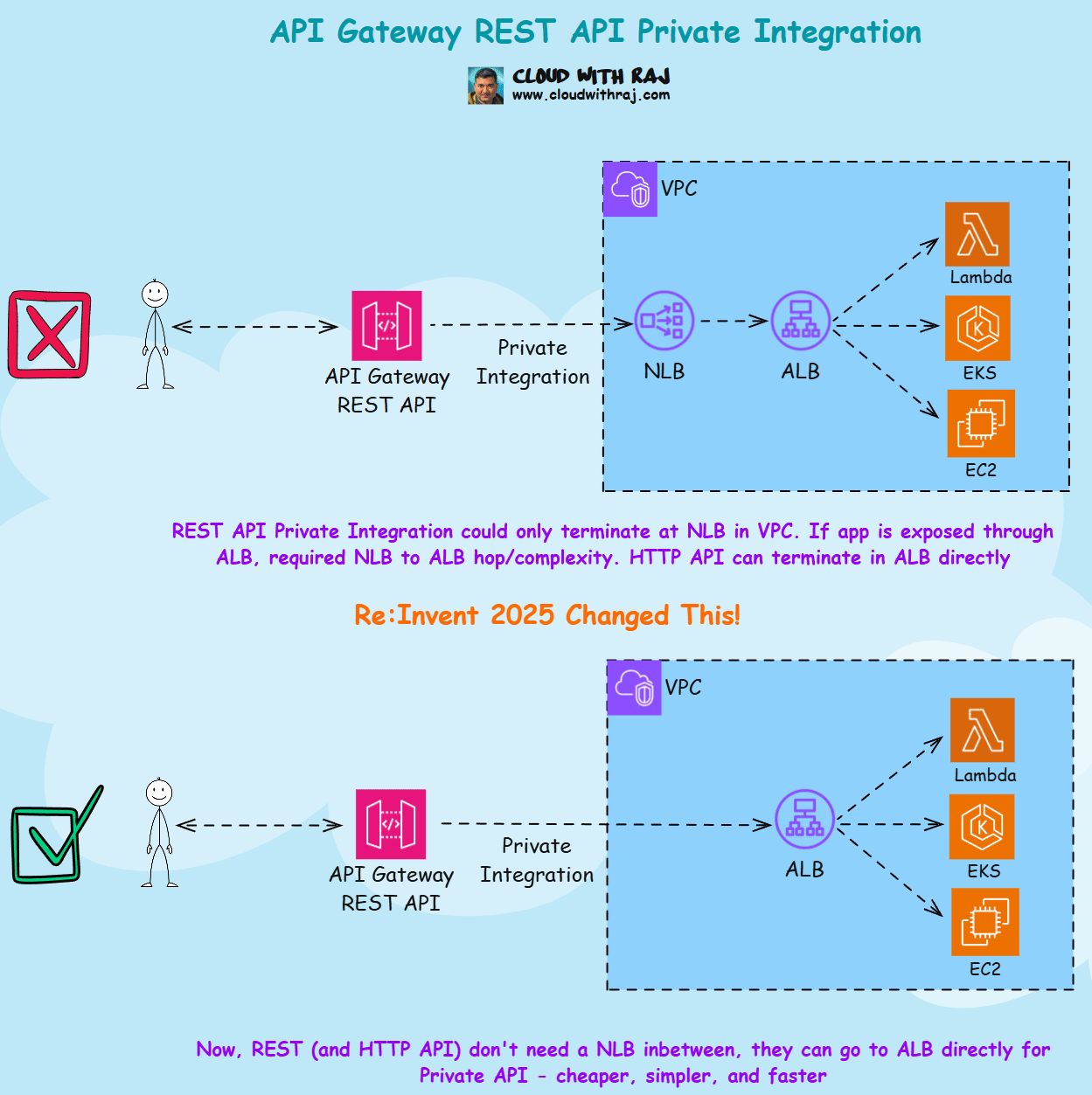 HTTP API can reach to either ALB and NLB today. But REST API has more features, and more widely used. Want to get personally trained by me and get cloud jobs?I run SA Bootcamp with Live Classes covering Technical, Behavioral, Mock Interviews, 1:1, Hands-On, LinkedIn/Resume Improvement, latest Gen AI topics, and more. Past students got high paying jobs including at AWS, Microsoft, Google, Databricks, JPMC, Reddit, CoreWeave and more.