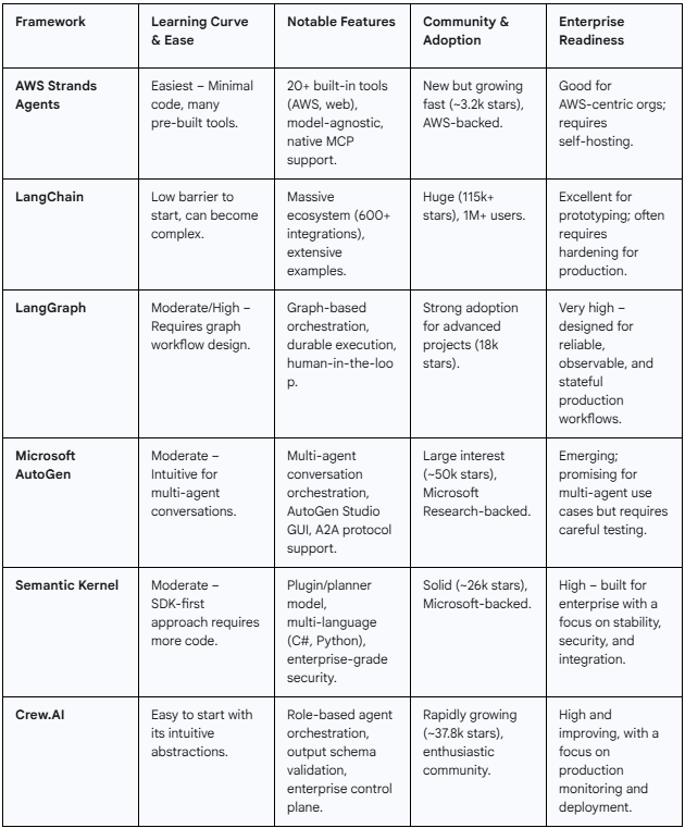 Hello Reader, AI agent frameworks have created a crowded and confusing landscape. This edition offers a direct, value-focused comparison of these popular frameworks, examining their features, ease of use, enterprise readiness, and ideal use cases to help you decide which is best suited for your project. This edition of the newsletter is written by Adam Bluhm, Principal AI Engineer at HiddenLayer, and a former award-winning Senior Solutions Architect at AWS. Adam Bluhm builds and architects secure mission-ready GenAI applications for the U.S. national security community. He lives in the Greater St. Louis area, raising a family and is a former VMware Staff Architect and USAF veteran. Follow Adam on his YouTube, and LinkedIn. Off to you, Adam... Hi, Adam here 👋! In almost all my customer conversations this topic comes up - which AI Agent is suitable for their workloads. With options like AWS Strands Agents, LangChain, LangGraph, Microsoft’s AutoGen and Semantic Kernel, and Crew.AI, selecting the right tool is critical. Let's get started.. 1. AWS Strands-Agents - Minimal-Code, AWS-Powered AgentsReleased in May 2024, AWS Strands Agents is an open-source SDK designed for simplicity and speed. It employs a “model-driven” approach where developers define an agent’s goal via a prompt and provide a list of tools. The framework, powered by the underlying LLM’s reasoning capabilities, autonomously handles the planning and execution of tool calls. Key Features: Strands ships with over 20 pre-built tools for common tasks like getting the current time (current_time), calling AWS services (use_aws), and making web requests (http_request), significantly accelerating proof-of-concept development. It is model-agnostic but features tight integration with the AWS ecosystem and supports emerging standards like Anthropic’s Model Context Protocol (MCP) for dynamic tool discovery. Pros: Its primary advantage is ease of use, allowing developers to build functional agents with minimal Python code. Its open-source nature and flexibility to use non-AWS models are also significant benefits. Cons: Strands is not a fully managed service; users are responsible for hosting, scaling, and monitoring the agent code on their own infrastructure (e.g., EC2, Lambda). As a newer framework, it has a smaller community (~3.2k GitHub stars) compared to more established alternatives. Ideal Use Case: Rapidly prototyping agents that perform cloud tasks or call APIs, especially within the AWS ecosystem. It is an excellent choice for building proofs-of-concept and demos with a minimal learning curve. 2. LangChain - The Popular Swiss Army Knife for LLM ApplicationsLangChain is one of the most widely recognized libraries for building LLM-powered applications. It is a comprehensive framework that provides components for prompts, memory, vector stores, and, most notably, tool-using agents based on reasoning strategies like ReAct. Strengths: LangChain’s main draw is its vast ecosystem of over 600 integrations, making it easy to connect an agent to nearly any data source or tool. Its massive community (100k+ GitHub stars) ensures extensive documentation, tutorials, and support. High-level APIs simplify initial development, making it a popular choice for hackathons and initial prototypes. Weaknesses: The framework’s many layers of abstraction can make complex agents difficult to debug and may introduce performance overhead. Originally designed for prototyping, its default agent implementations can lack the robustness required for production environments, a limitation that led to the development of LangGraph. Ideal Use Case: Prototyping LLM applications that require connecting multiple components, such as a RAG pipeline with tool-use capabilities and conversational memory. It serves as an excellent starting point for many projects, though complex applications may eventually require more specialized tooling. 3. LangGraph - Structured and Stateful Orchestration for ProductionIntroduced by the LangChain team, LangGraph provides a stateful orchestration framework for designing agents as controllable graphs. It replaces the simple, autonomous loop of a basic agent with a structured workflow of nodes and edges, offering greater control, reliability, and observability for complex tasks. Strengths: LangGraph is built for production. It offers durable execution, persistent memory, human-in-the-loop checkpoints, and rich debugging via LangSmith. Its graph-based architecture is flexible, allowing developers to implement various patterns like sequential tool use, reflection cycles, or multi-agent collaboration with explicit control flow. Learning Curve: LangGraph has a steeper learning curve than LangChain, as it requires developers to design the agent’s structure upfront. However, its control and reliability are significant payoffs for production-grade systems. Ideal Use Case: Enterprise developers building complex, reliable, and observable AI workflows. It is the logical next step for projects prototyped in LangChain that need to be hardened for production, particularly those involving long-running tasks, multi-agent systems, or steps requiring human oversight. 4. Microsoft AutoGen - Multi-Agent Conversations and CollaborationAutoGen is an open-source framework from Microsoft Research designed to facilitate collaboration between multiple LLM agents. It structures agent interaction as a conversation, where specialized agents can chat with each other and with human users to solve complex problems. Key Idea: Instead of a single agent, you define multiple agents with distinct roles (e.g., Planner, Solver, CodeExecutor). AutoGen orchestrates their dialogue, allowing one agent to delegate tasks to another. This conversational paradigm simplifies the implementation of sophisticated multi-agent patterns. Features: AutoGen supports an agent orchestration loop where agents can invoke each other as tools. The companion AutoGen Studio provides a 