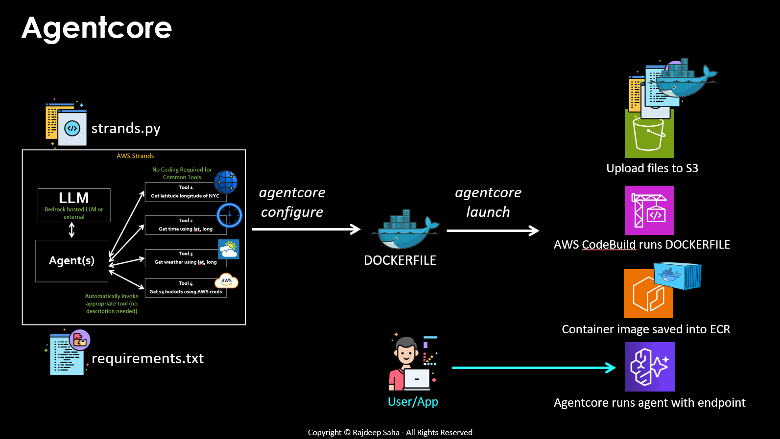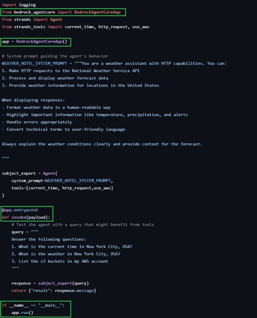 Strand Code to implement the above is below: Here is the code in less than 30 lines to implement the above (I am not joking). And as you can see, most of it is plain english. The powerful part is line 22, where I simply specify to use prebuilt tools - current_time (to get time!), http_request (automatically calls popular API endpoints to perform the task automatically!), and use_aws (to run boto3 commands using your natural language!) You no longer need to write separate Lambdas for separate tools. Great, you have your Strands code running on your laptop. Now what? The final goal is to run on AWS. You can upload this code and manage it yourself, such as upload this Strands code in lambda, or EKS, interface with ALB or API Gateway, instrument security, observability, keep up with upgrades etc. That's still lot of pain. Hence Bedrock AgentCore was born! 🚀 Bedrock AgentCoreBedrock AgentCore can help you run your agents on AWS in simple commands. Let's find out how: Step 1 : Change your code to run on Agentcore Don't fret, you just need to add couple lines, majority of your code stays same. If you take the above Strands code, you need to make the following changes marked by green rectangles, to make it AgentCore compatible Highlighted changes are: