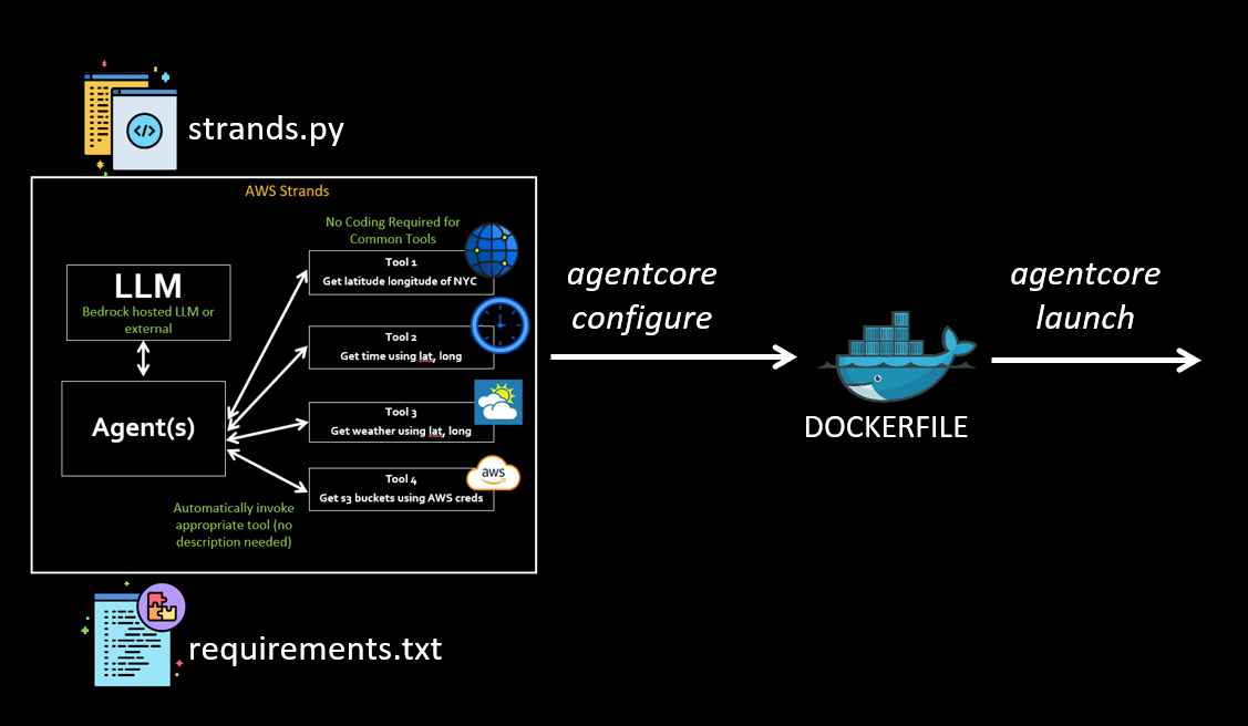 Hello Reader, Another week, another AI announcement. But this one is worth studying because this one will become the defacto standard of running agents on AWS. I am talking about newly released Amazon AgentCore. Let's dive in. 🧩 The Big Picture: Why Agents Exist Let’s break it down using a practical example: What happens when a user asks an LLM app: What’s the time in New York? What’s the weather there? List my S3 buckets The LLM don't have these information, hence it needs to invoke tools...
